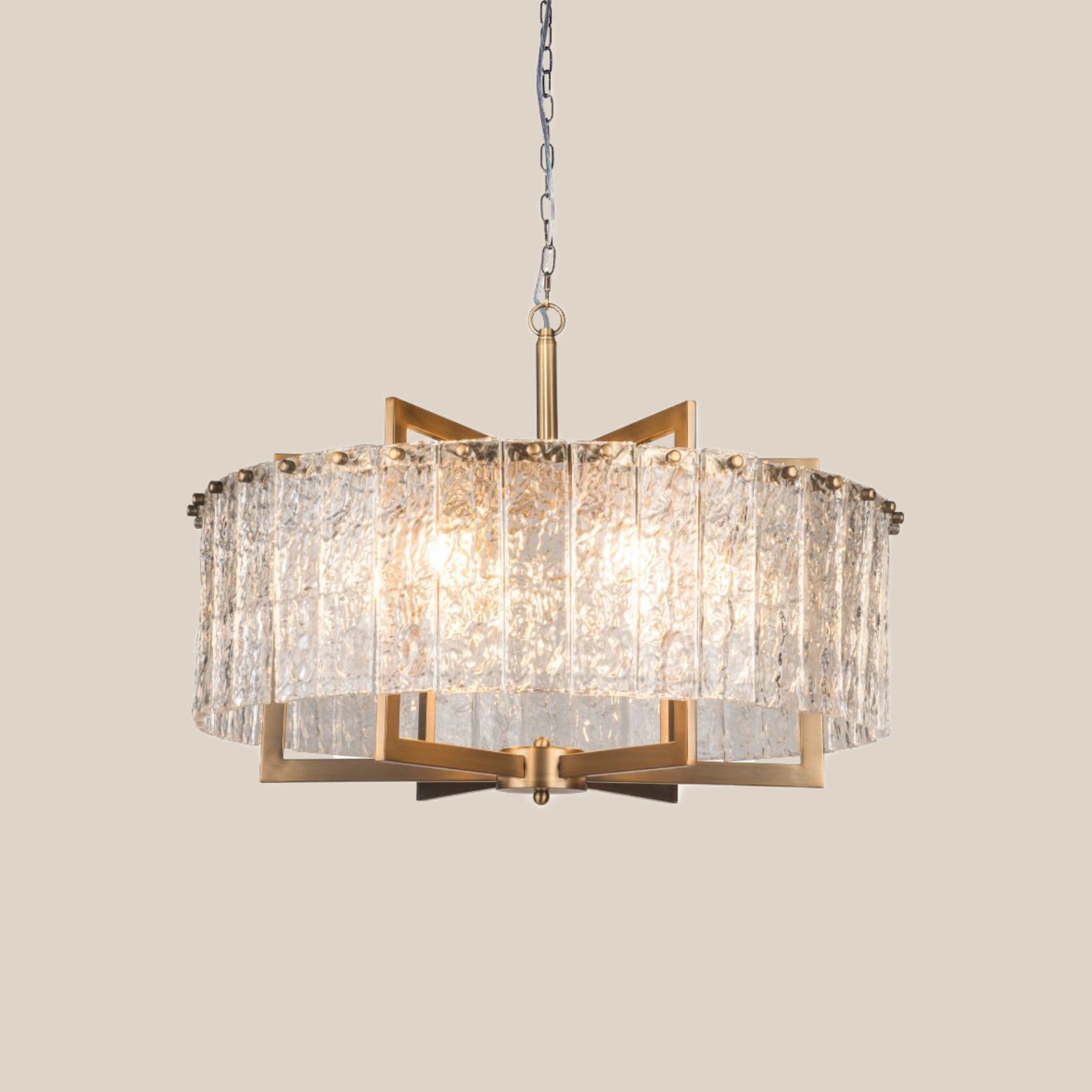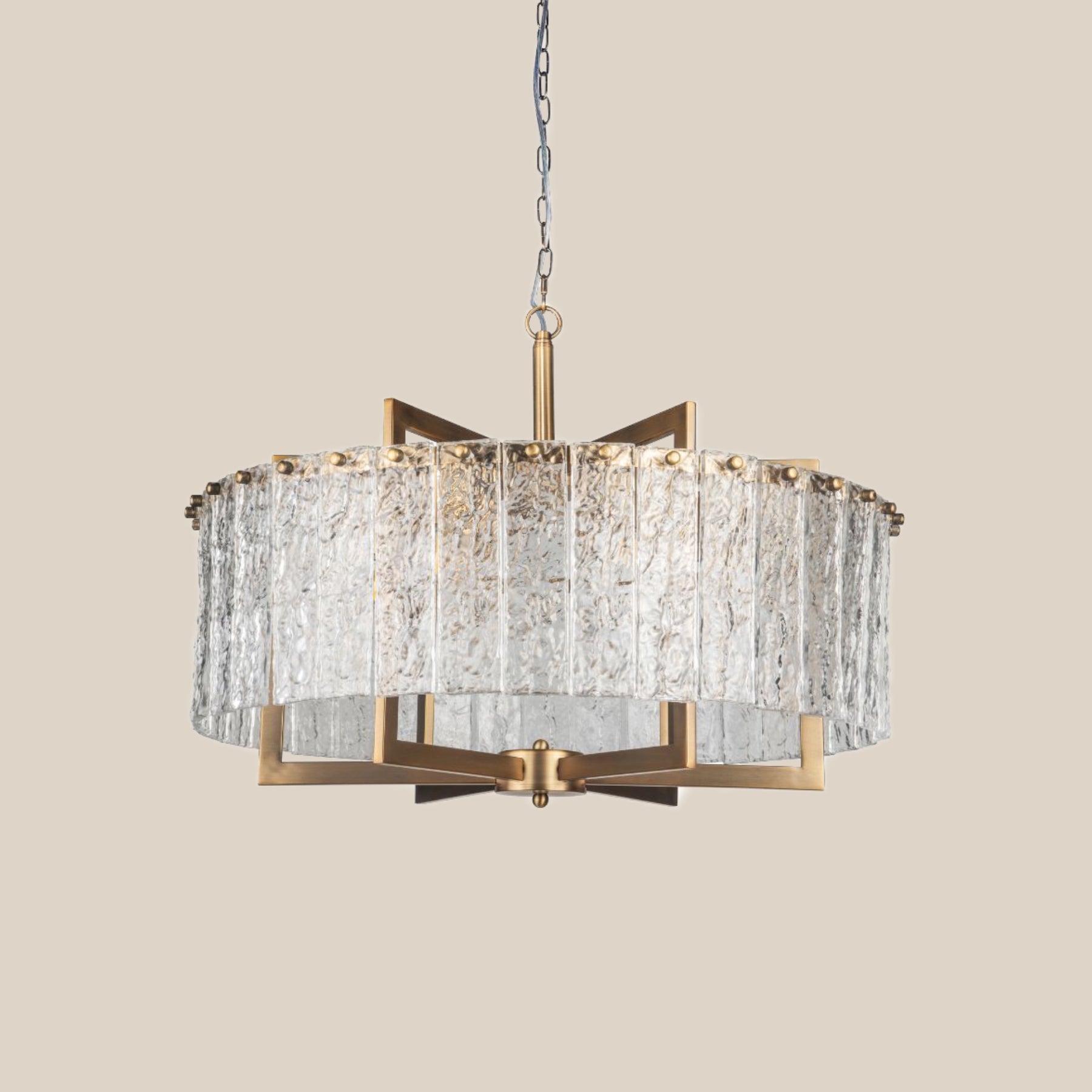 Inspired by the glamour of mid-century modernist design, the Leona Round Chandelier pairs architectural brass framework with panels of textured glass. The rippled glass diffuses light with unparalleled brilliance. Suspended from forged chain hardware, this commanding fixture anchors dining rooms and entryways with the same refined presence found in Europe's most celebrated hotel interiors. A masterwork of form and function, the Leona stands as both sculptural centrepiece.