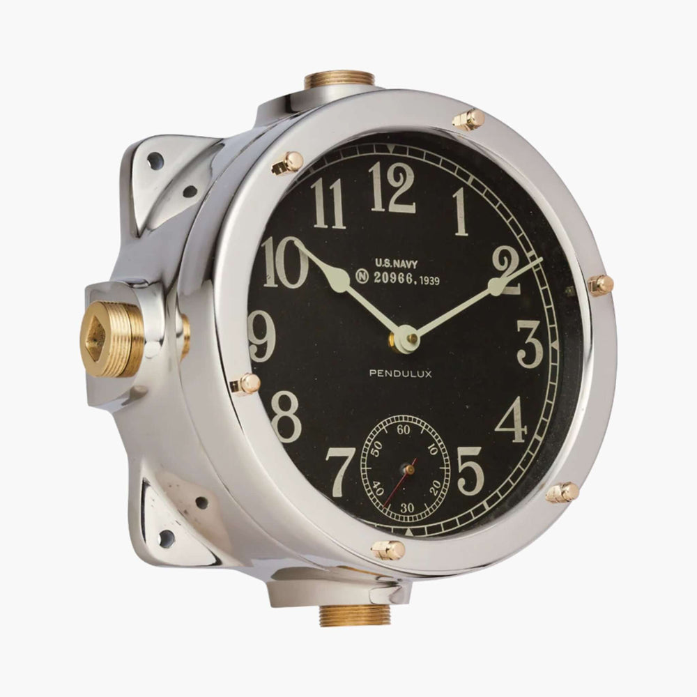 Introducing our meticulously crafted replica of the iconic 1939 US Navy master ship clock. Impeccably designed to capture the essence of its original counterpart, this remarkable timepiece boasts an array of authentic features, including a fully functional sub dial with a precise seconds hand. Just like its historical predecessors, these clocks were once proudly mounted in the operations room of grand vessels, commanding authority over every other clock on board. Crafted from robust aluminium, the sturdy casing of this clock bravely endured the relentless forces of the sea, proving its resilience in the face of harsh conditions.
