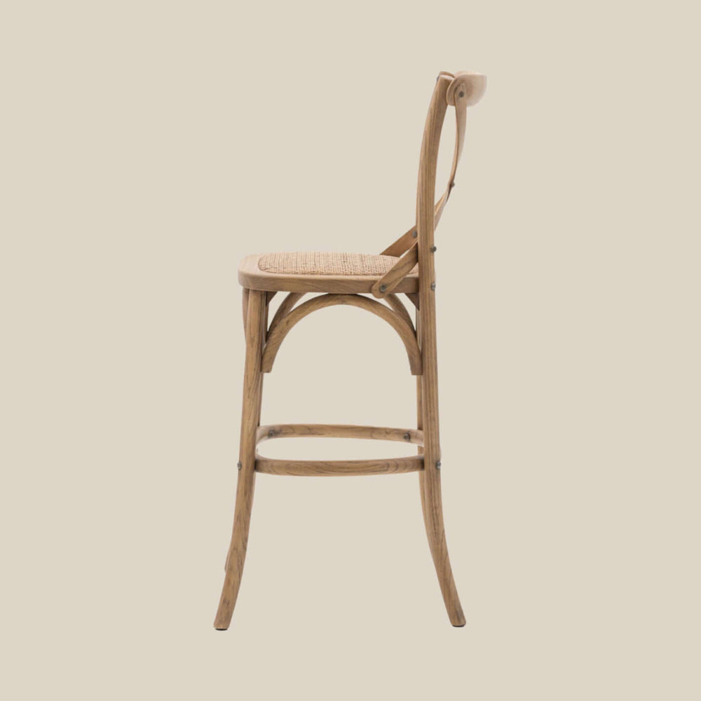 Crafted with an impeccable oak frame, the Cross Back Counter Stool stands as a testament to the enduring beauty of natural materials. The rich, warm tones of the oak create a foundation of strength and durability, while the handwoven rattan seat adds a layer of intricate texture and artisanal quality. The stool’s signature cross back design not only provides stylish support but also evokes a sense of refined nostalgia, harkening back to the chic bistros of Paris.