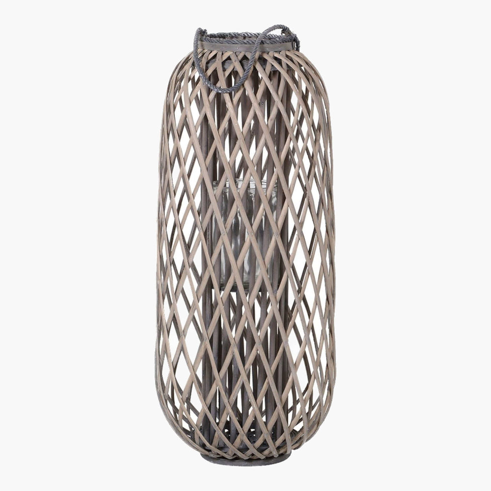 Encapsulated in an interwoven willow frame sits a clear glass candle lantern. The large scale makes a dramatic statement floor lantern. Perfect on its own or paired as a group.