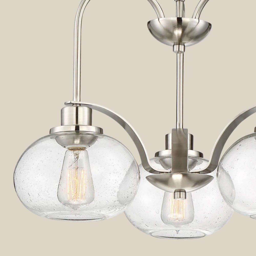 Crafted for looks and practicality. Exquisite seeded glass adds a touch of luxury, while the classic chandelier design creates an impactful look. The steel frame masterfully suspends the glass shades creating visual balance.