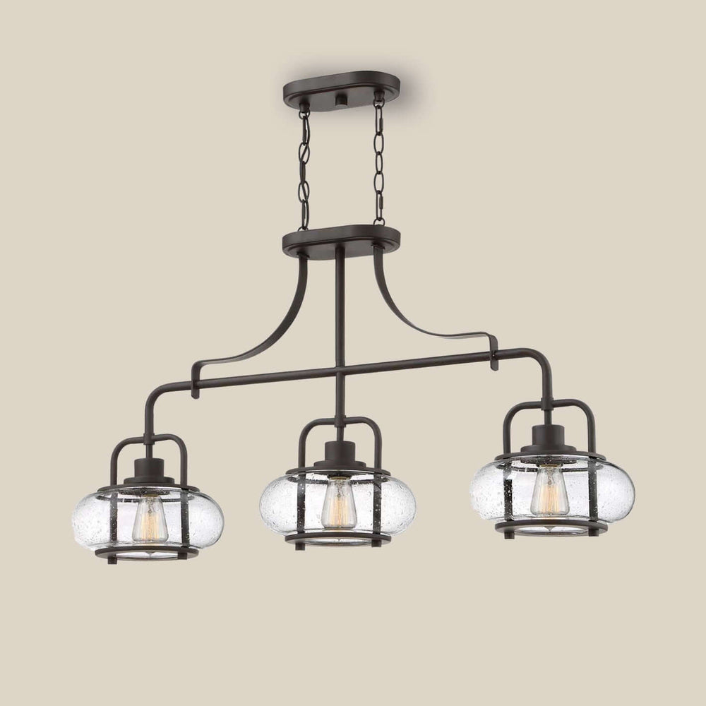 Crafted for looks and practicality. Exquisite seeded glass adds a touch of luxury, while the classic island light design creates an impactful look. The steel frame masterfully suspends the glass shades creating visual balance.