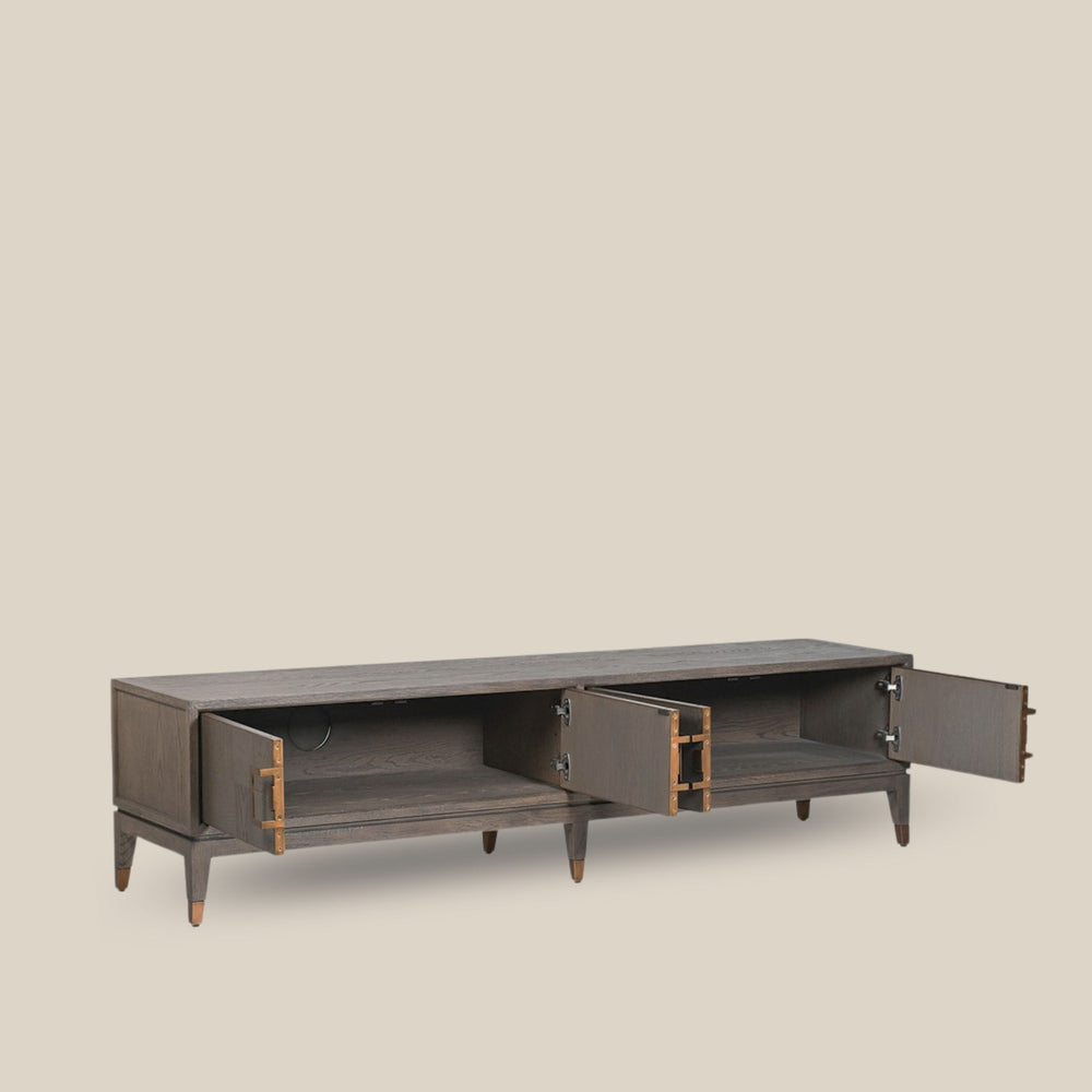 Our striking Hallé 4-door entertainment unit lets the natural beauty of oak take centre stage. Crafted with a distinctive pattern, the design celebrates the exquisite wood grain. Distinctive metal handles lend a modern design element that cleverly contrasts with the tone and texture of the wood.