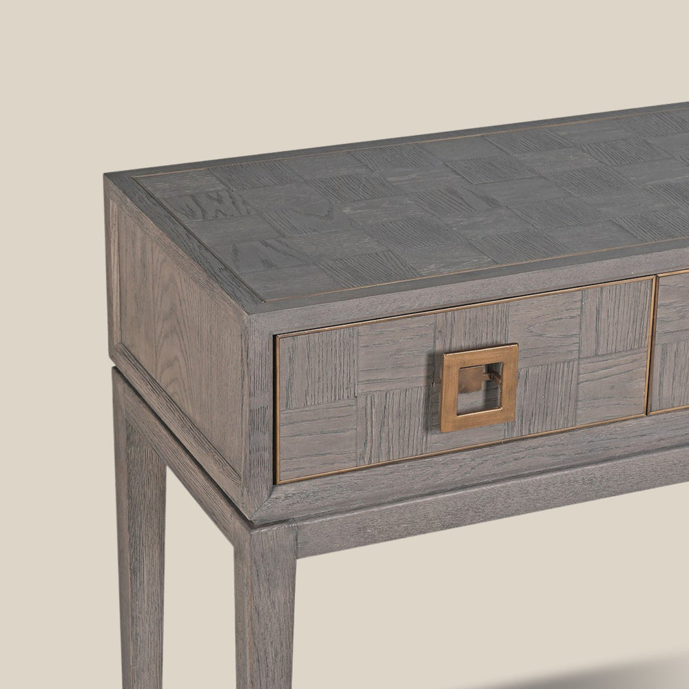 Our striking Hallé 4-drawer console table lets the natural beauty of oak take centre stage. Crafted with a distinctive pattern, the design celebrates the exquisite wood grain. Distinctive metal trim lends a modern design element that cleverly contrasts with the tone and texture of the wood.