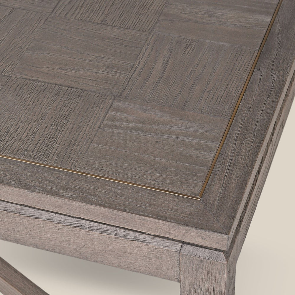 Our striking Hallé coffee table lets the natural beauty of oak take centre stage. Crafted with a distinctive pattern, the design celebrates the exquisite wood grain. Distinctive metal trim lends a modern design element that cleverly contrasts with the tone and texture of the wood.