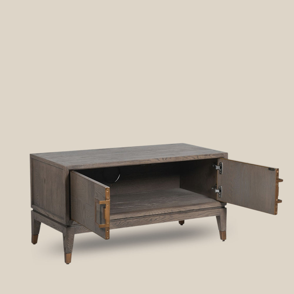 Our striking Hallé 2-door entertainment unit lets the natural beauty of oak take centre stage. Crafted with a distinctive pattern, the design celebrates the exquisite wood grain. Distinctive metal handles lend a modern design element that cleverly contrasts with the tone and texture of the wood.