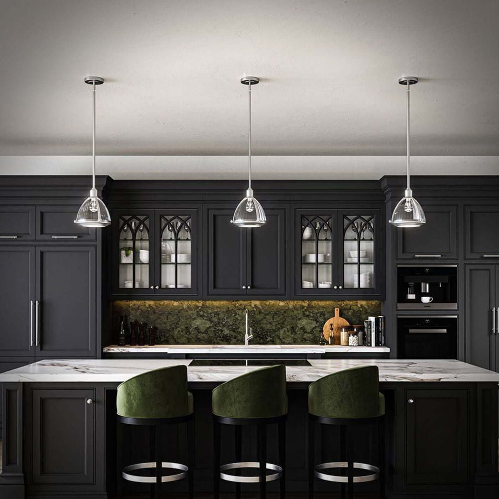 A timeless silhouette crafted with an exquisite ribbed glass cloche shade and industrial inspired metal frame forms our Aveton pendant creating a luxurious and sophisticated piece.