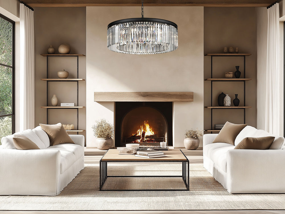 Elegant combining a round shape and straight lines our Fitz chandelier takes influence from 1920s French Art Deco. Its slender glass prism rods form carefully hung from the metal frame form two concentric rings to disperse the light.